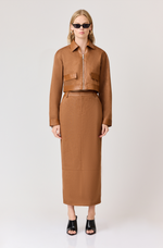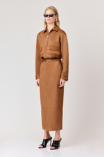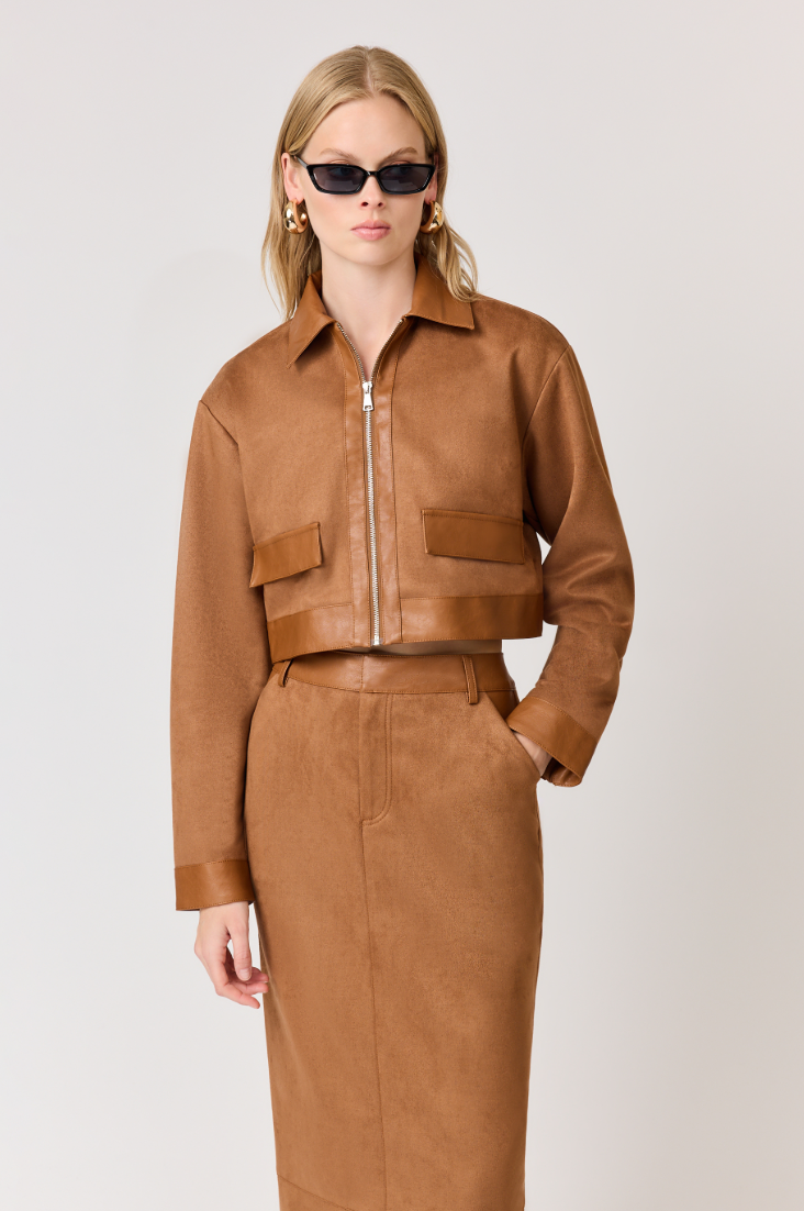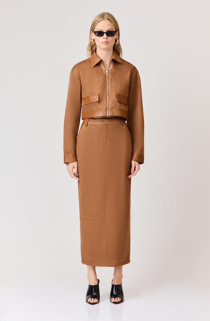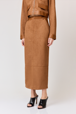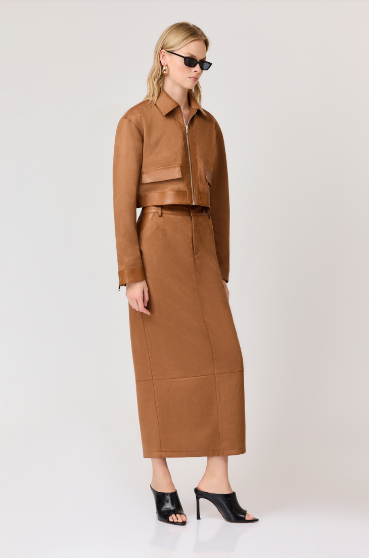 Unit price perSleek and softly structured, the ARLO SUEDE SKIRT blends refined tailoring with an edge. Crafted from faux suede with vegan leather accents, it features a front zip, belt loops, and a bottom panel detail for added texture. Pair it with the matching jacket or a tucked-in blouse for a clean, elevated look.
