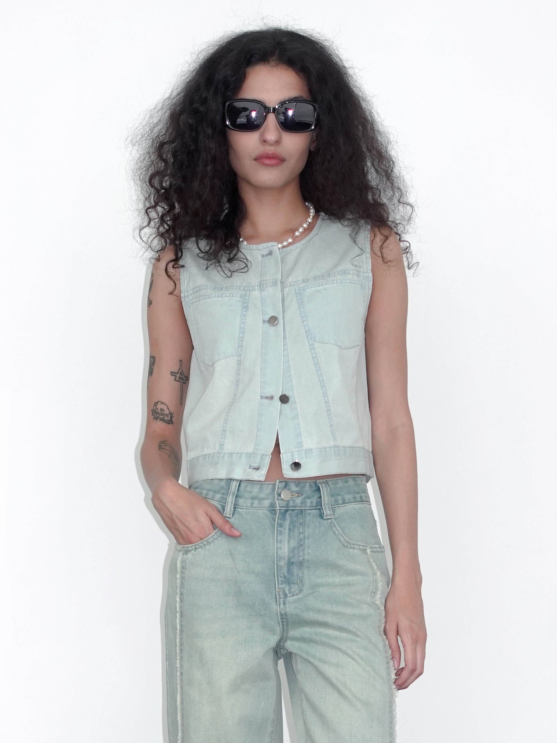 Unit price perThe Colette Denim Tank Vest redefines classic denim with a modern, sleeveless silhouette. Crafted from 100% cotton denim in a light-washed finish, this versatile piece is perfect for layering or wearing solo. Featuring a front button-up closure with metallic buttons, it offers a structured yet effortless look. Two chest pockets add a touch of utility, blending timeless design with contemporary functionality.