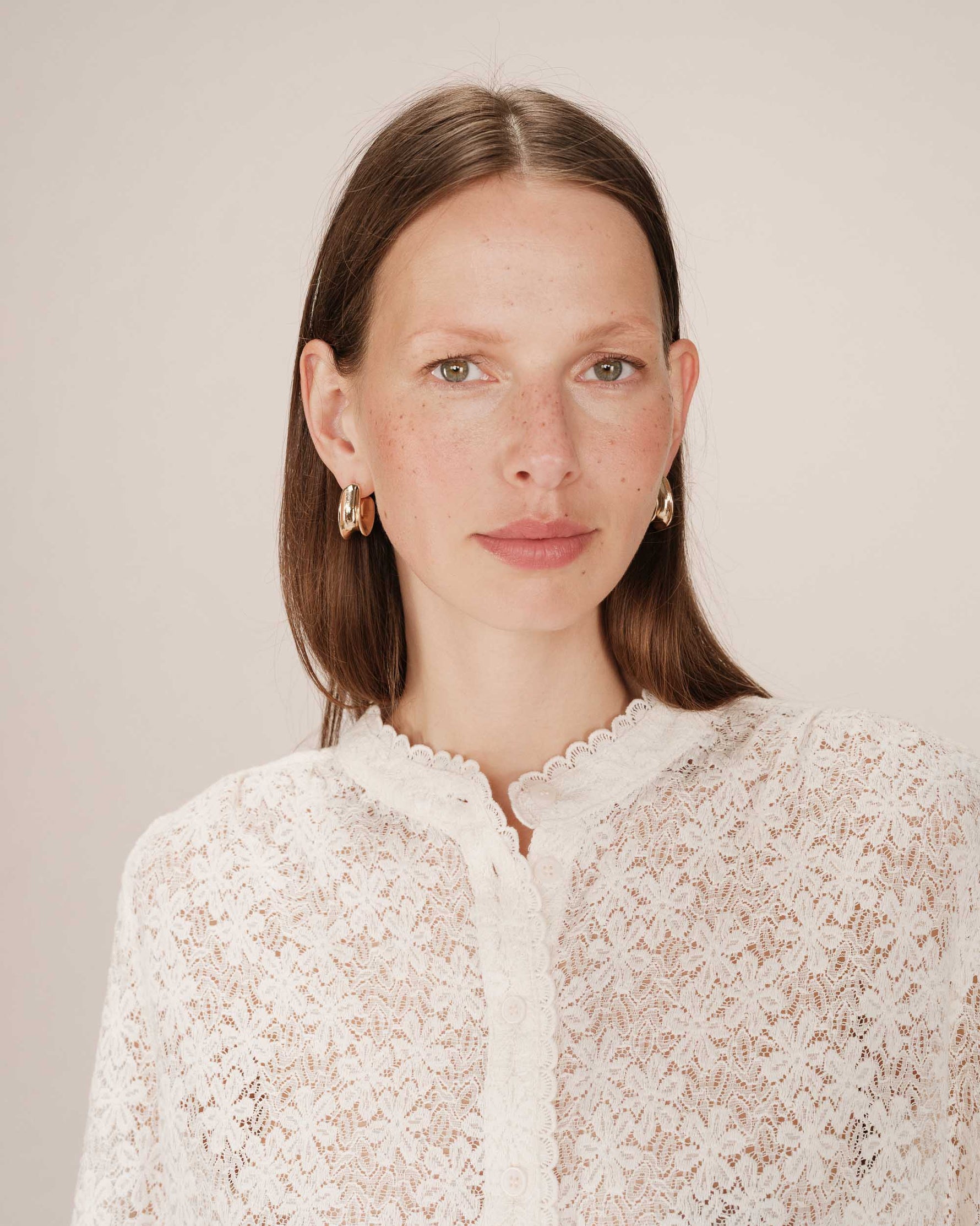 The SWING BLOUSE blends vintage charm with romantic detailing. Made from a soft cotton-blend lace, this feminine blouse features delicate trim along the neckline and front, gathered accents at the shoulders and cuffs, and subtly ruffled long sleeves. Its straight cut and buttoned front make it a timeless piece for dressing up or down. Pair it with tailored trousers or denim for a look that feels both elegant and easy.